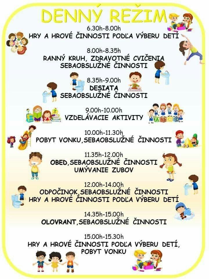 Cieľom každého dňa je dosiahnuť optimálnu, perceptuálno-motorickú, kognitívnu a citovo-sociálnu úroveň ako základ pripravenosti na ďalšie vzdelávanie a na život v spoločnosti. Východiskom je jedinečnosť dieťaťa, aktívne učenie a začlenenie do skupiny a kolektívu.